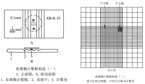 16×25型的計數(shù)板 將計數(shù)室放大,可見它含16中格,一般取四角:1、4、13、16四個中方格(100個小方格)計數(shù)(見圖二)。將每一中格放大,可見25個小格。計數(shù)重復(fù)3次,取其平均值。計數(shù)完畢后,依下列公式計算: